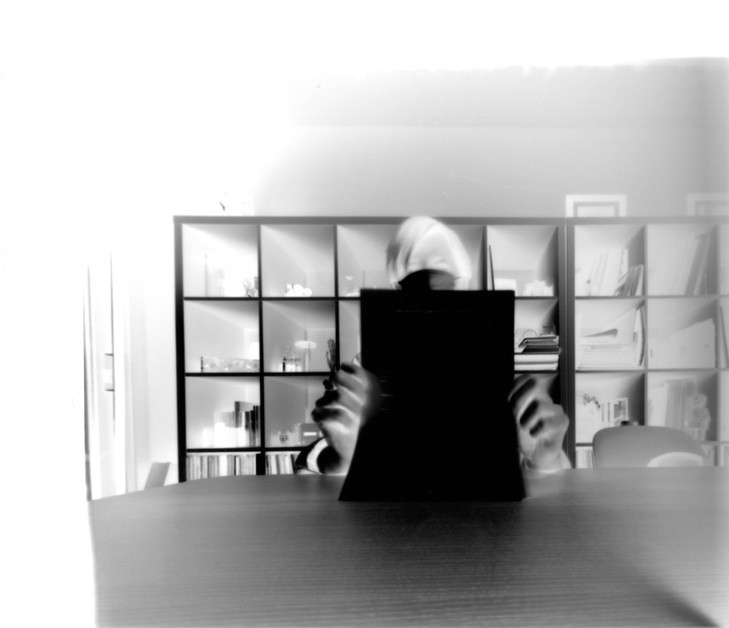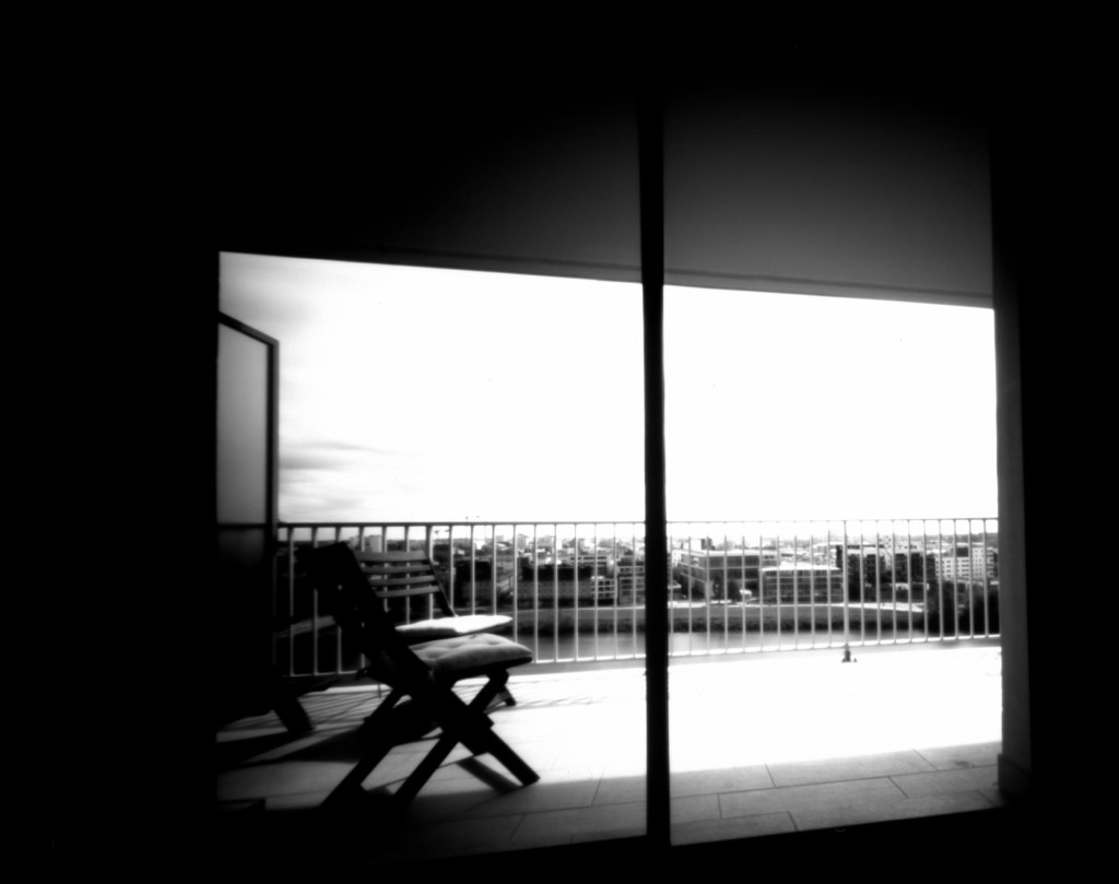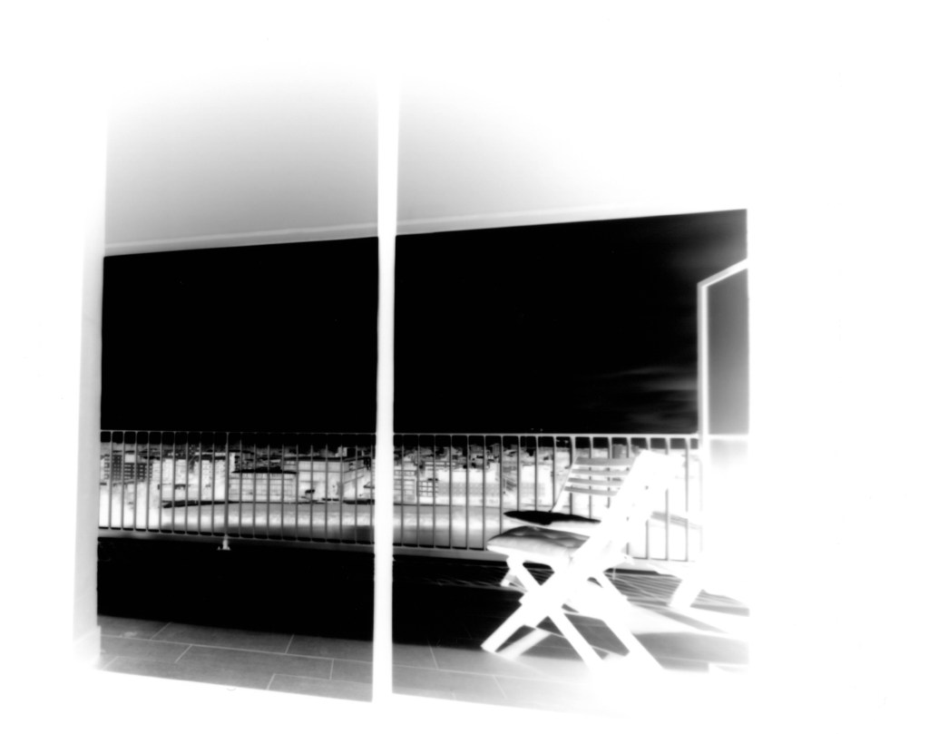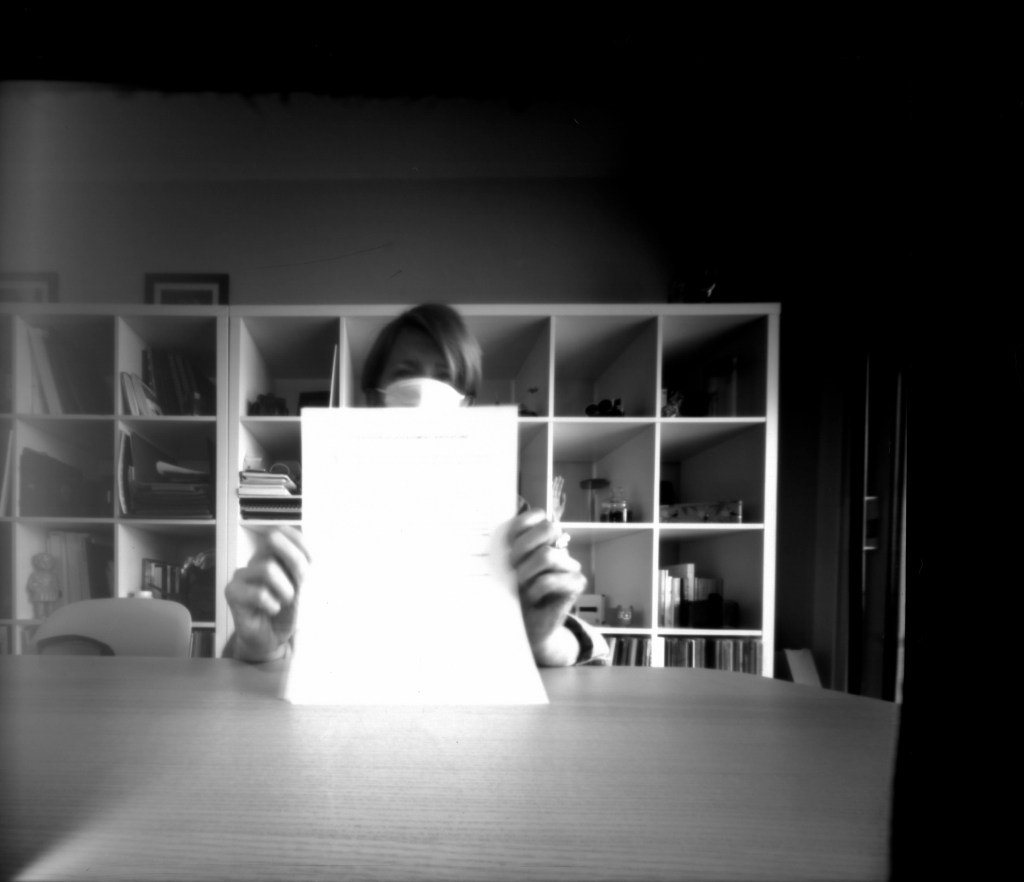 Le sténopé est prévu pour y insérer un châssis 4×5, ce qui donne du papier 10 x12,5. Il faut donc massicoter des feuilles !