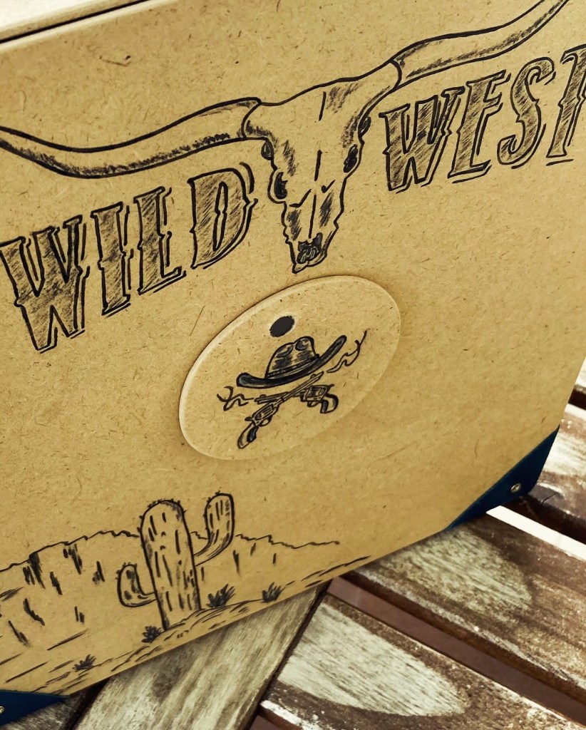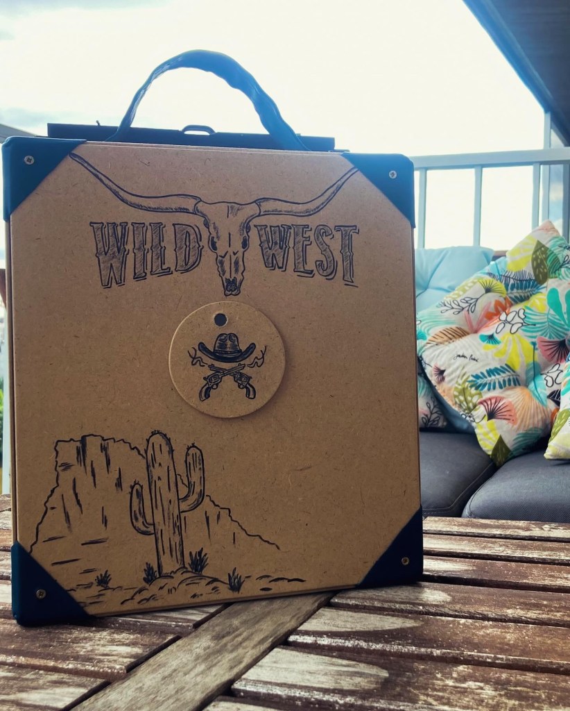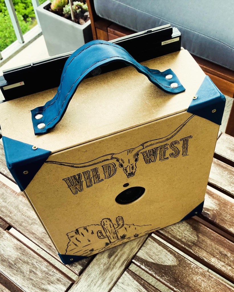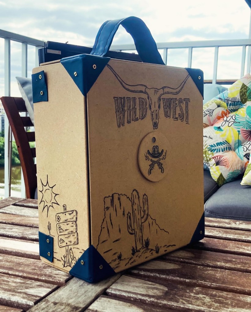 La structure intérieure est en carton plume, avec des renforts en bois (baguette de bois). Ensuite, je l’ai recouvert de bois médium de 2/3 mm d’épaisseur. Les coins sont en cuir, de même que la poignée.