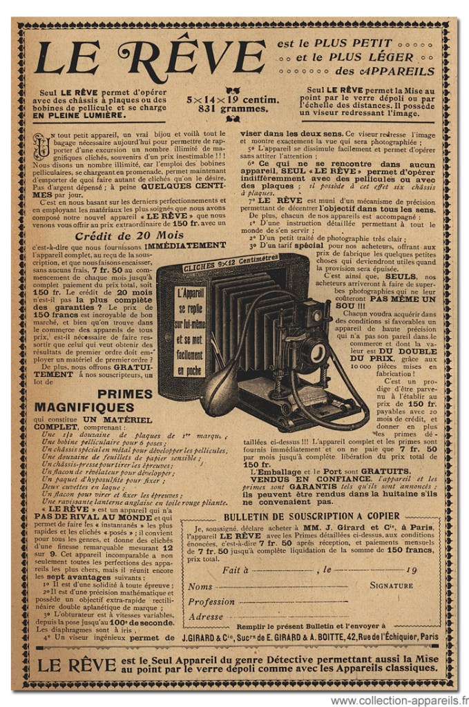 Il n’est pas aisé de trouver des informations sur ce folding en particulier mais il semble qu’il ait été fabriqué par la société E. Girard & A. Boitte à une date située entre 1902 et 1907 et disponible par souscription d’après ce type d’annonce :